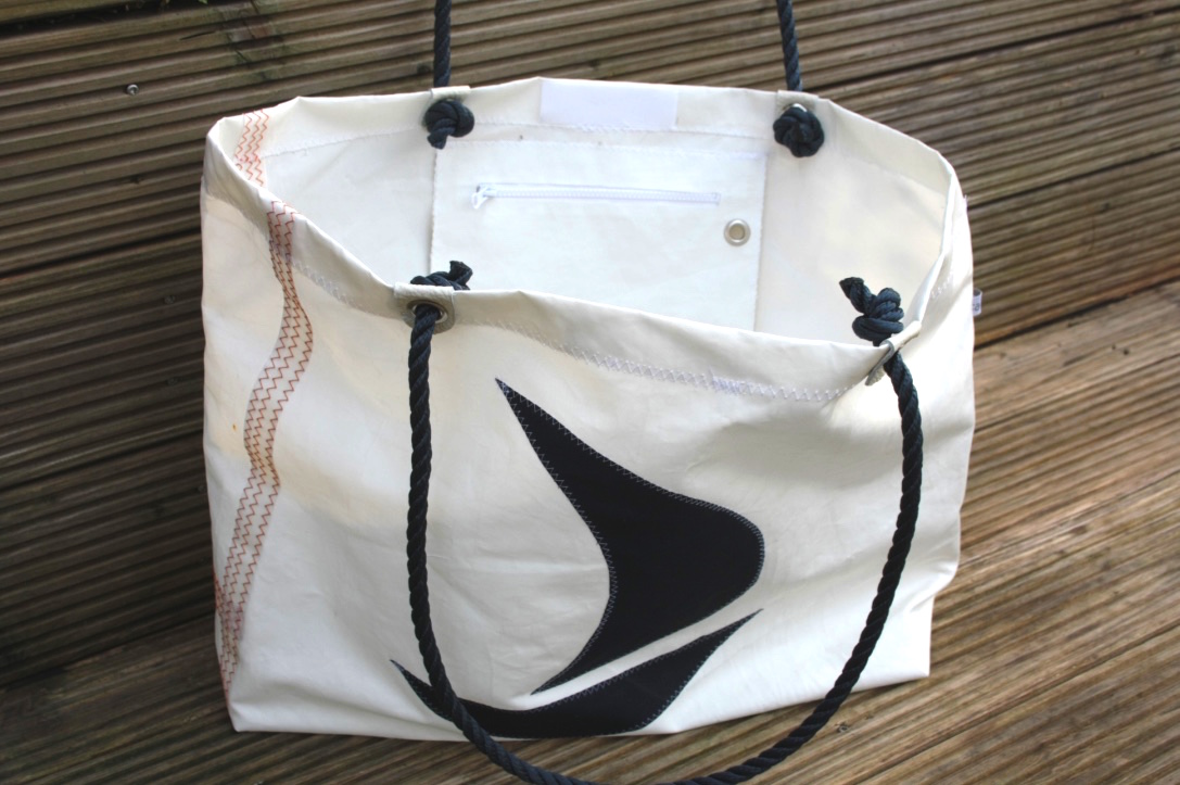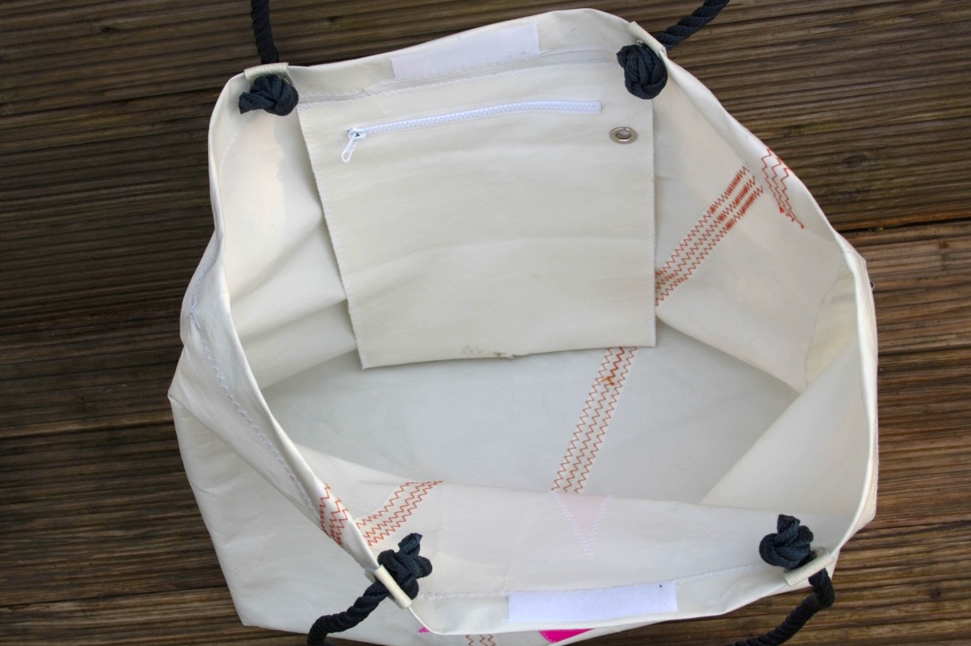 Die die große Segeltuchtasche Shopper / Beach ist die ideale Tasche für den Tag am Strand. Auch als täglicher Shopping Begleiter eignet sie sich hervorragend. Diese einzigartige Tasche ist aus robustem Segeltuch von Hand gefertigt. Das Segeltuch ist von einem benutztem Vorsegel von uns upgecycelt. Kleinere Verschmutzungen und Flecken können vorhanden sein und sind gewollt ( shabby chic ). Die Tasche besitzt noch eine kleine Innentasche mit Reißverschluss. Jede Segeltasche ist ein Unikat, weshalb die Segelnähte von denen auf den Bildern abweichen können. Die Taschen können bei 40° in der Waschmaschine gewaschen werden. Bitte die Tragetaue nicht waschen.